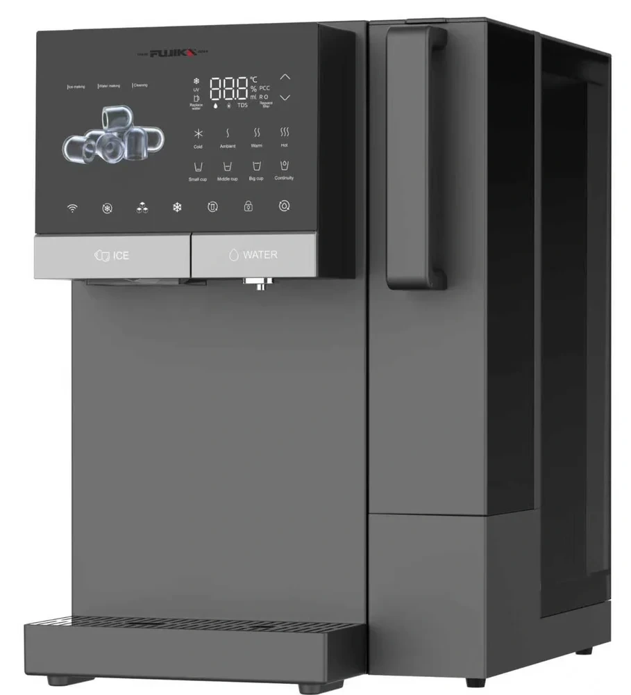 Fujika FU-W90 هو الجهاز متعدد الوظائف النهائي للمطبخ. يجمع بين منقي التناضح العكسي عالي الأداء وصانع الثلج المدمج، مما يتيح لك الاستمتاع بمكعبات ثلج نقية إلى جانب الماء الساخن والبارد.